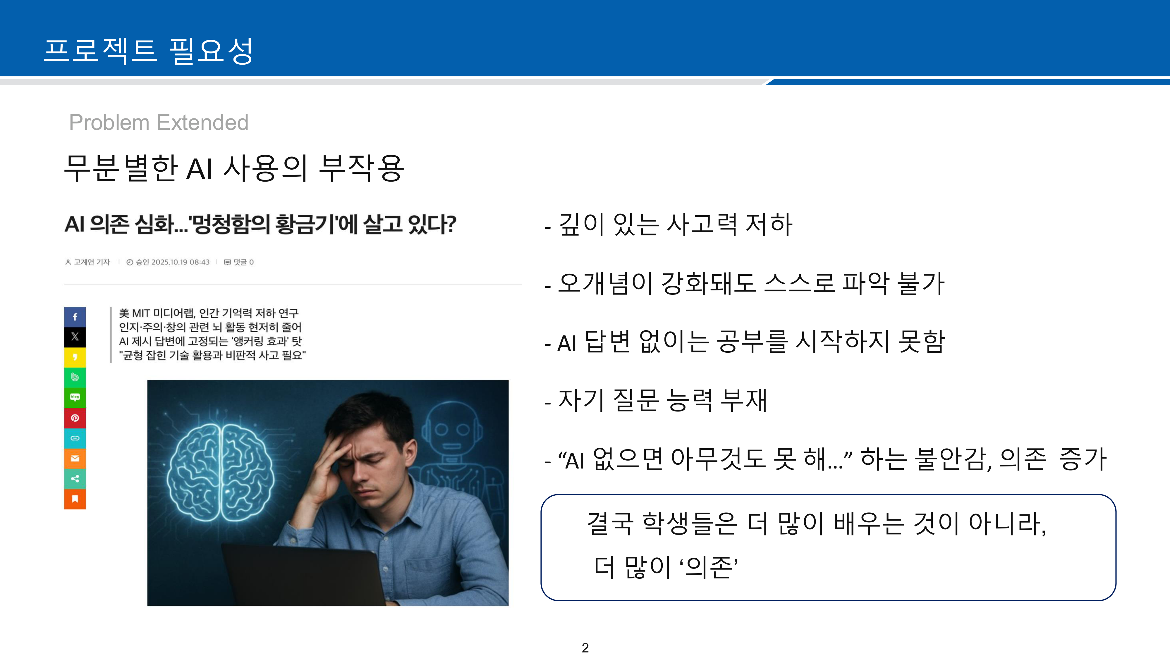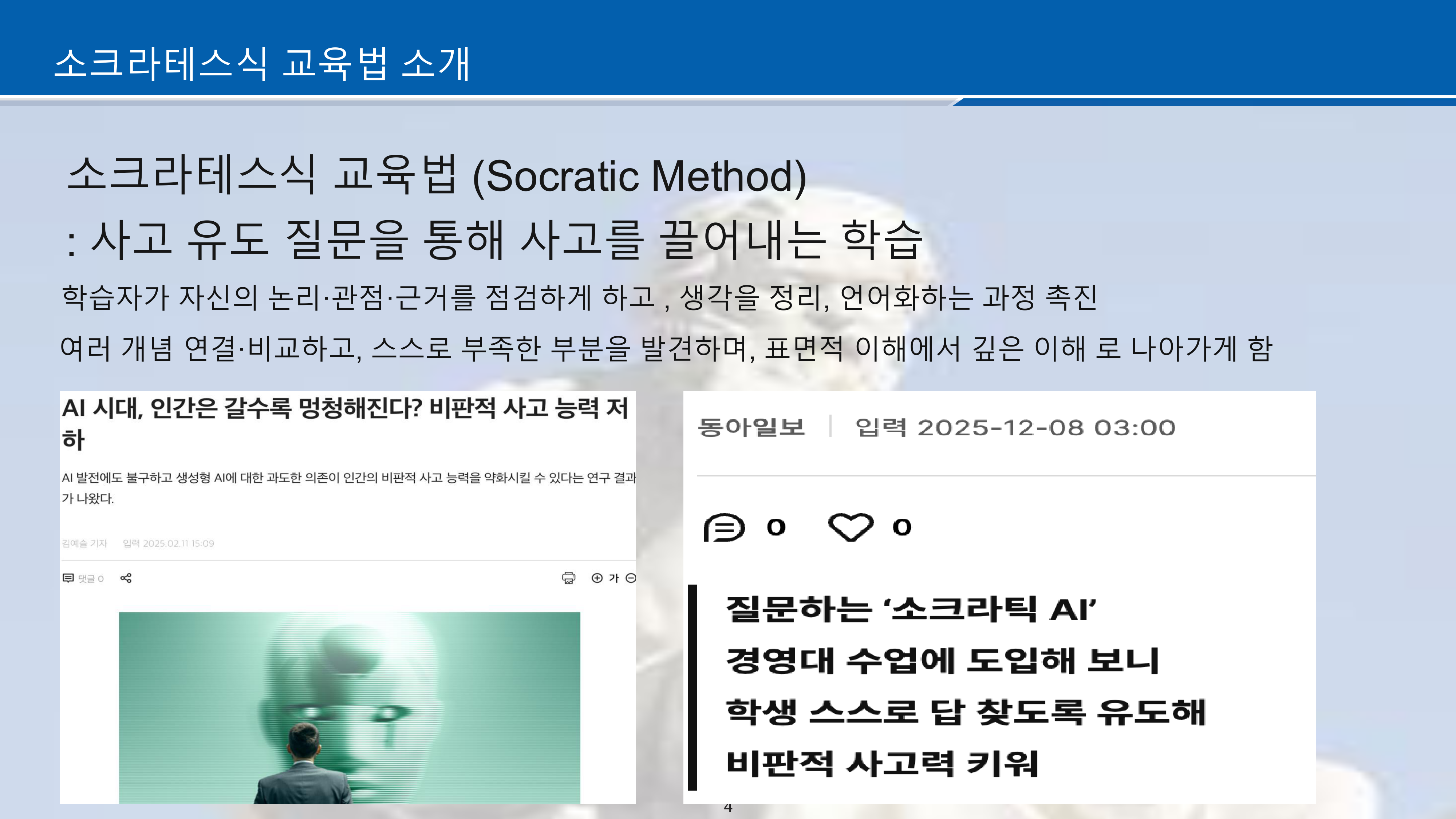 최근 생성형 AI 사용이 급격히 증가하면서 학생들이 과제나 학습 시 AI에 과도하게 의존하게 되고, 이로 인해 논리적·비판적 사고 능력이 저하되는 문제가 대두되었습니다. 기존 AI는 질문에 대해 바로 답을 나열하는 단방향 방식인 반면, 소크라테스 교육법은 사고를 유도하는 질문을 반복하여 학생이 스스로 답을 찾아가는 양방향 소통 방식입니다.