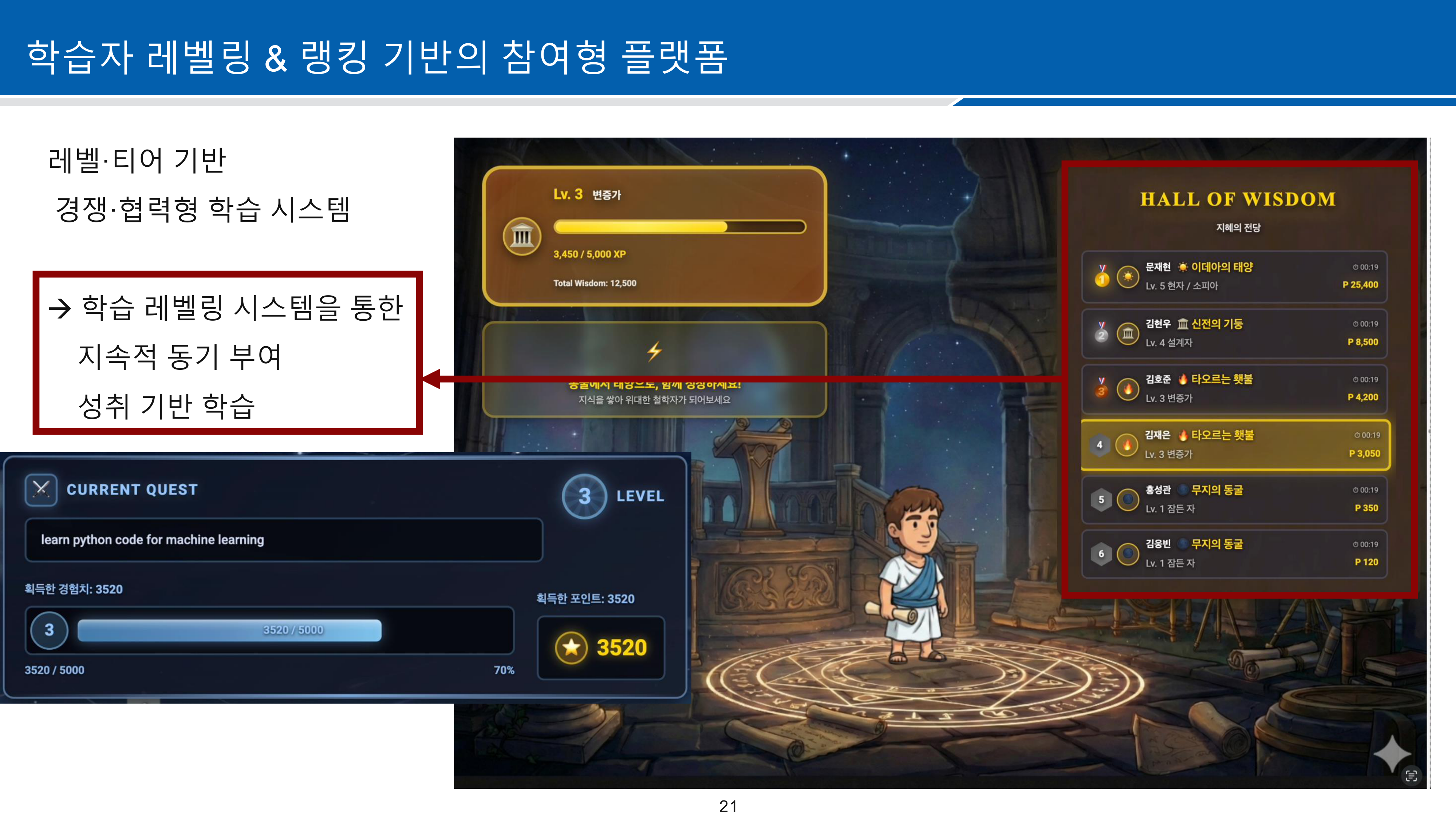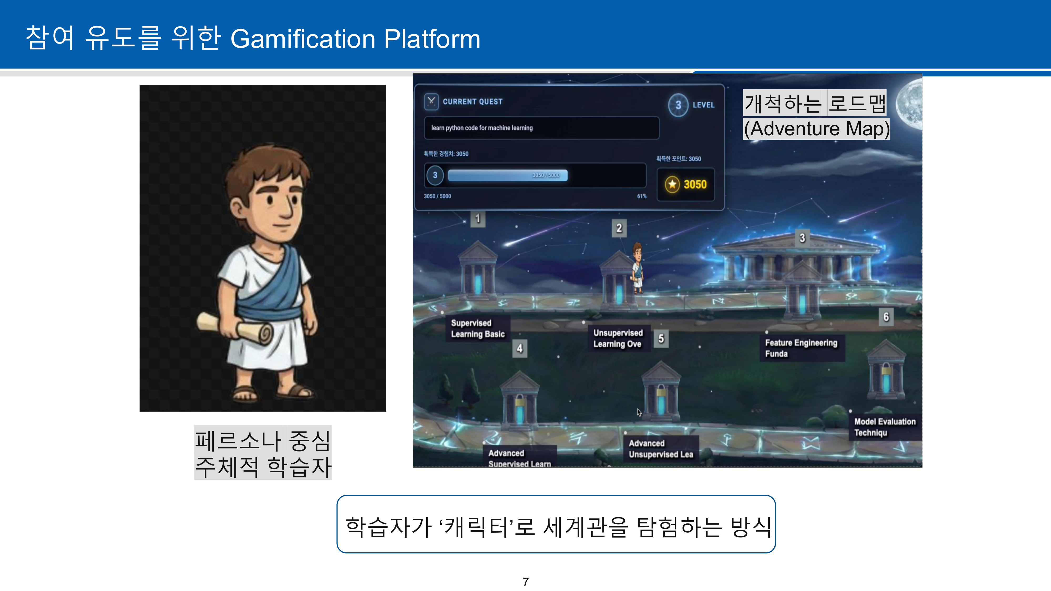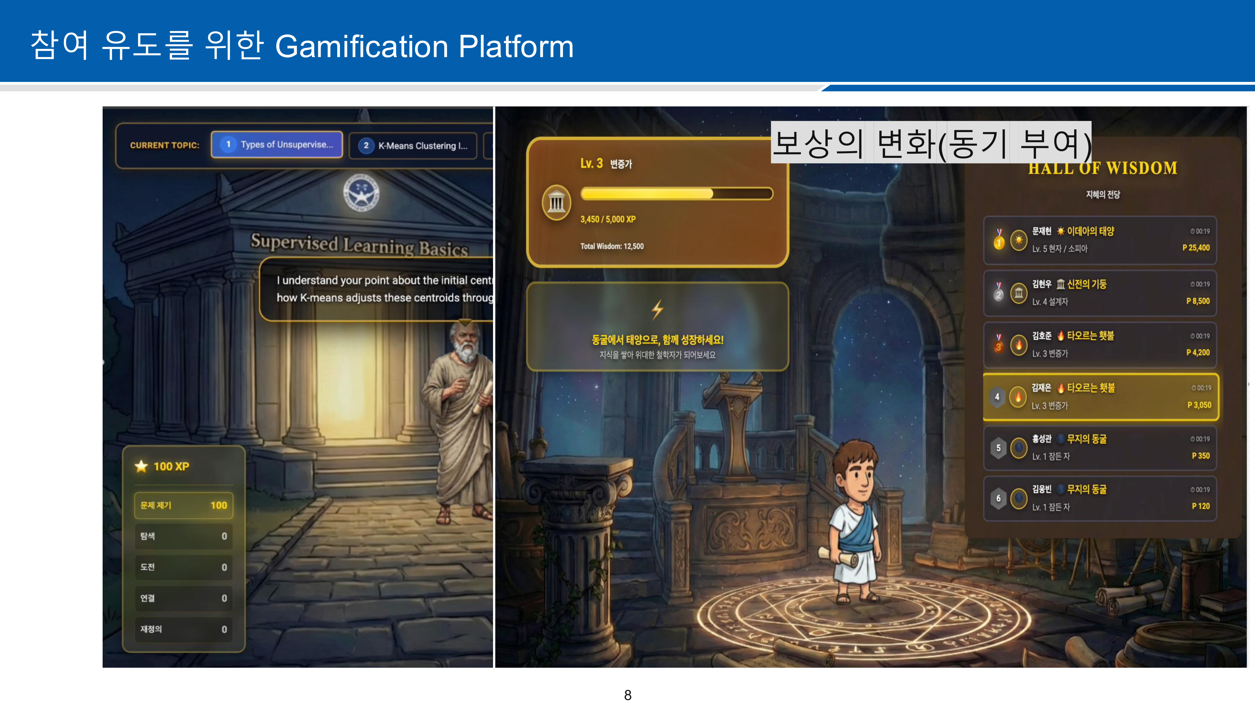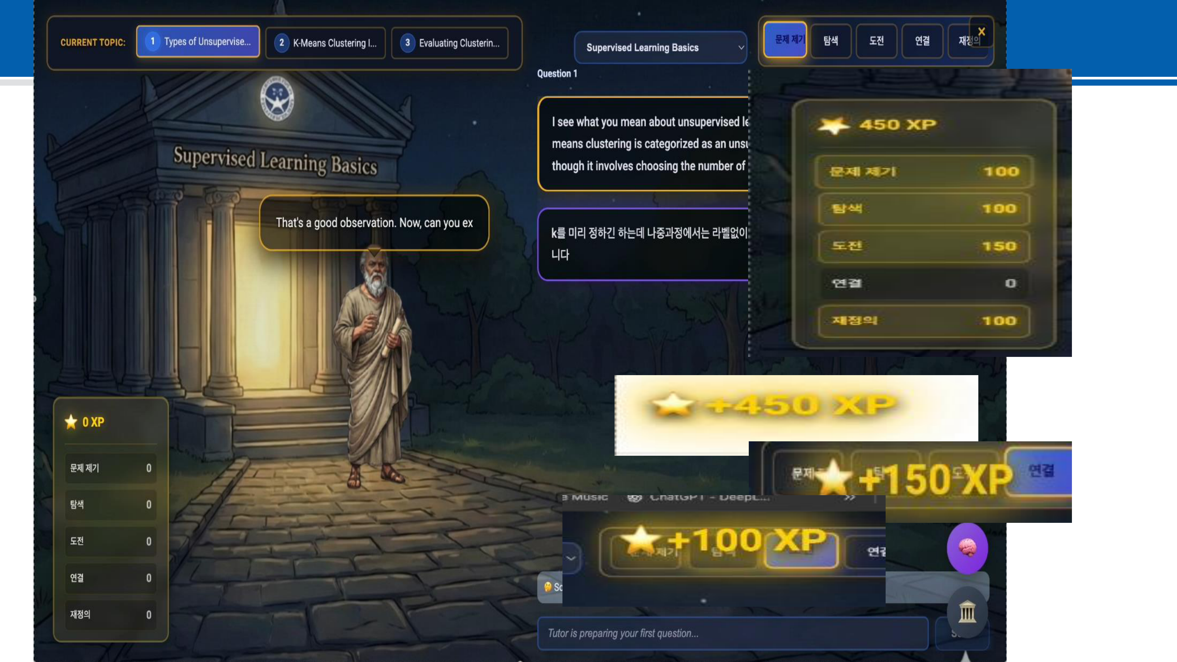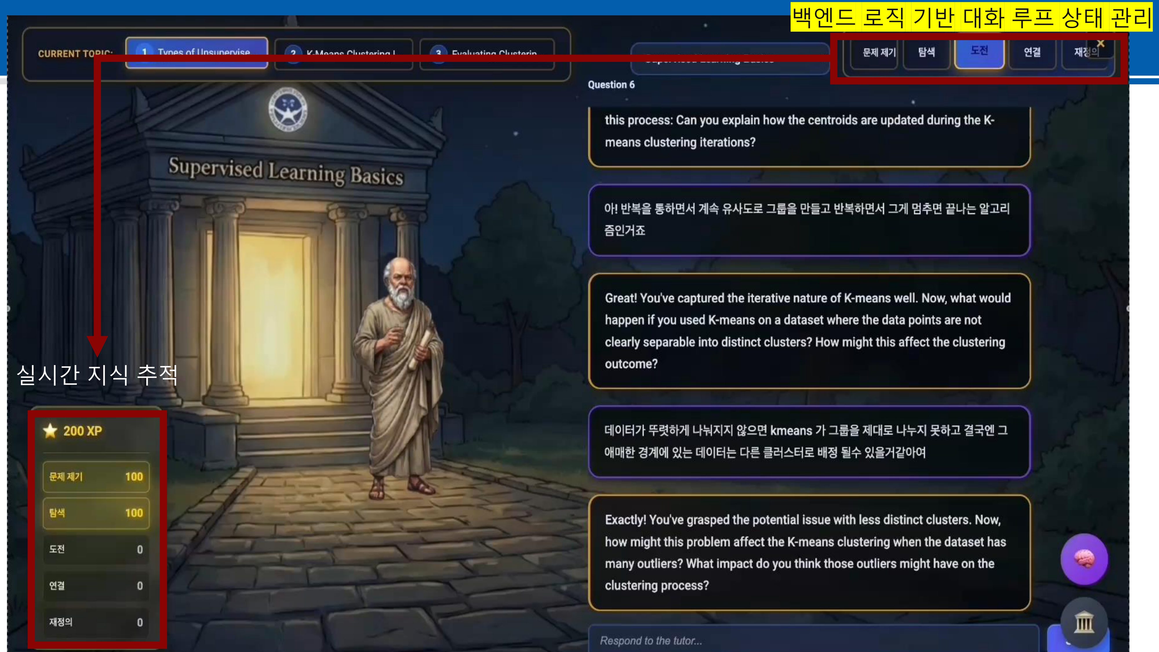 정적인 교육 시스템에 소크라테스 교육법만 적용할 경우 학습자의 참여도가 낮을 수 있어, Gamification 요소를 도입하였습니다. 각 관문을 깨어나가는 구조로 설계하여 학습 몰입도를 높였습니다.