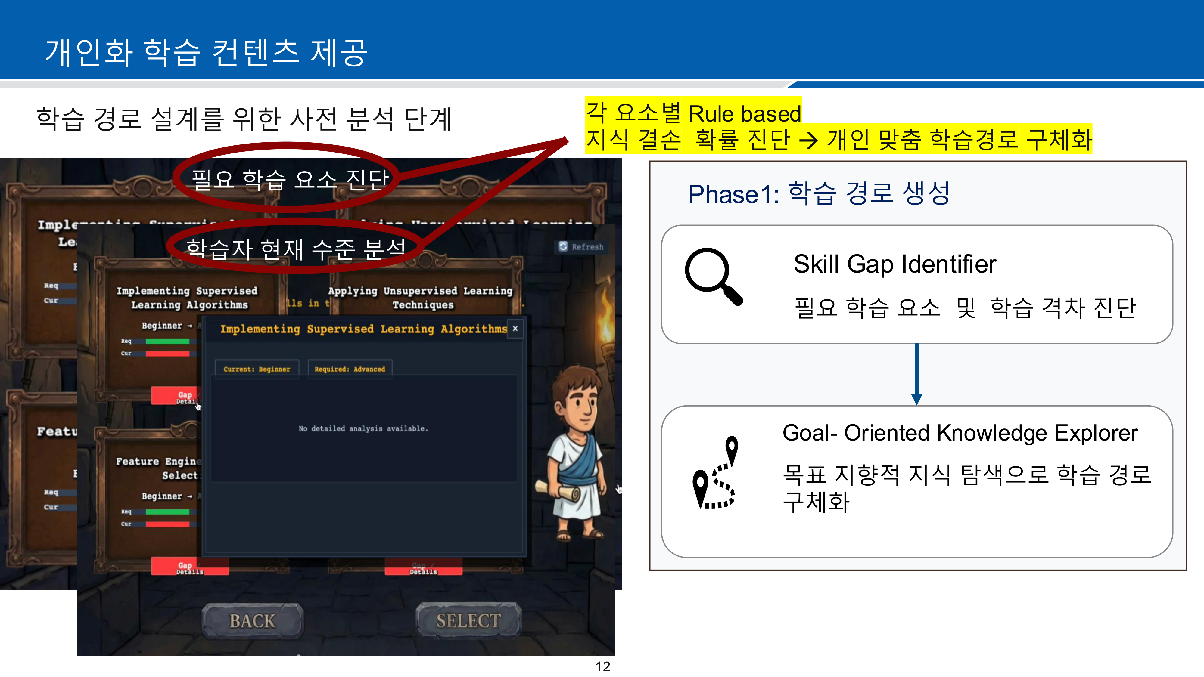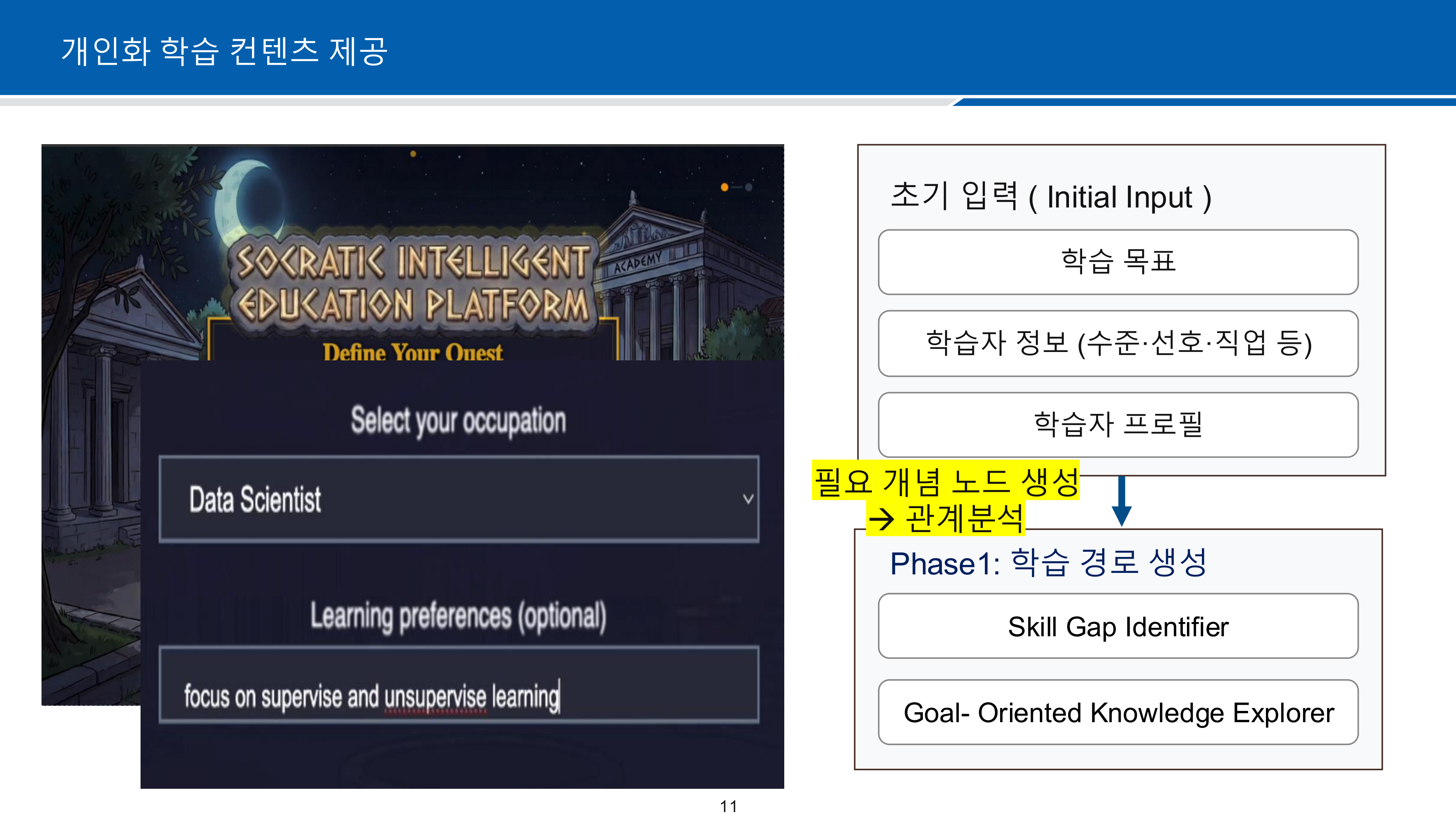 - Phase 1 - 학습 경로 생성: Skill Gap Identifier로 학습 격차를 분석하고, Goal-Oriented Knowledge Explorer로 맞춤 학습 경로 구체화