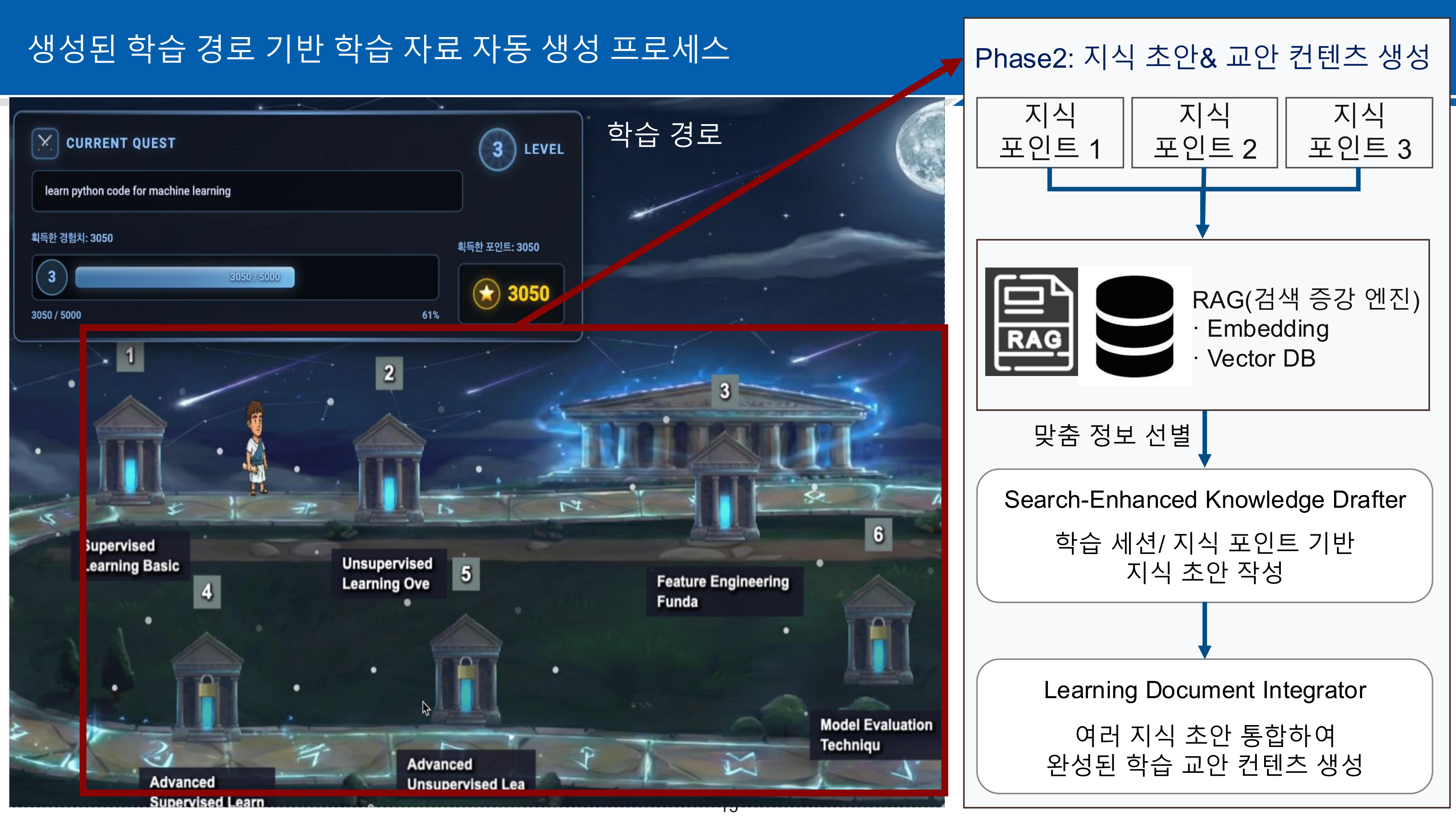 - Phase 2 - 지식 초안 및 교안 콘텐츠 생성: RAG(검색 증강 엔진)으로 최적 정보를 선별하고, Knowledge Drafter와 Learning Document Integrator를 통해 학습 교안 자동 생성