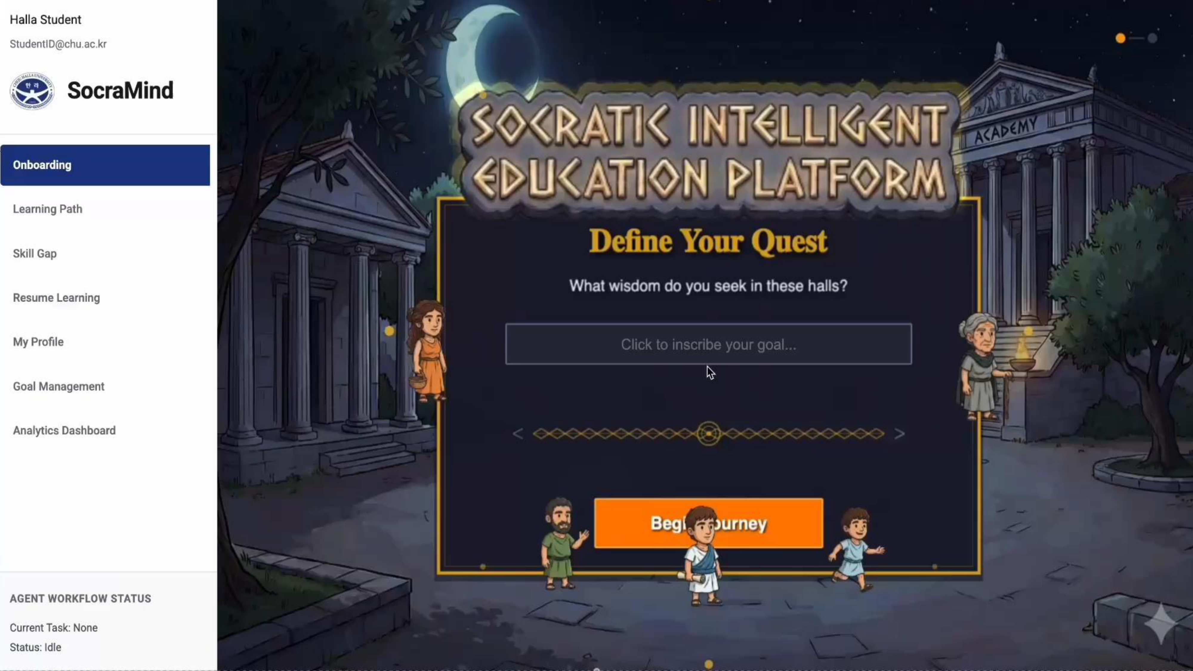 플라톤(보질/추상화), 아리스토텔레스(분석/체계화), 존 듀이(실용/경험) 등 서로 다른 역할의 에이전트가 컨텐츠를 구조화한 후 소크라테스 모듈에 입력하여 다각적 사고를 유도합니다.