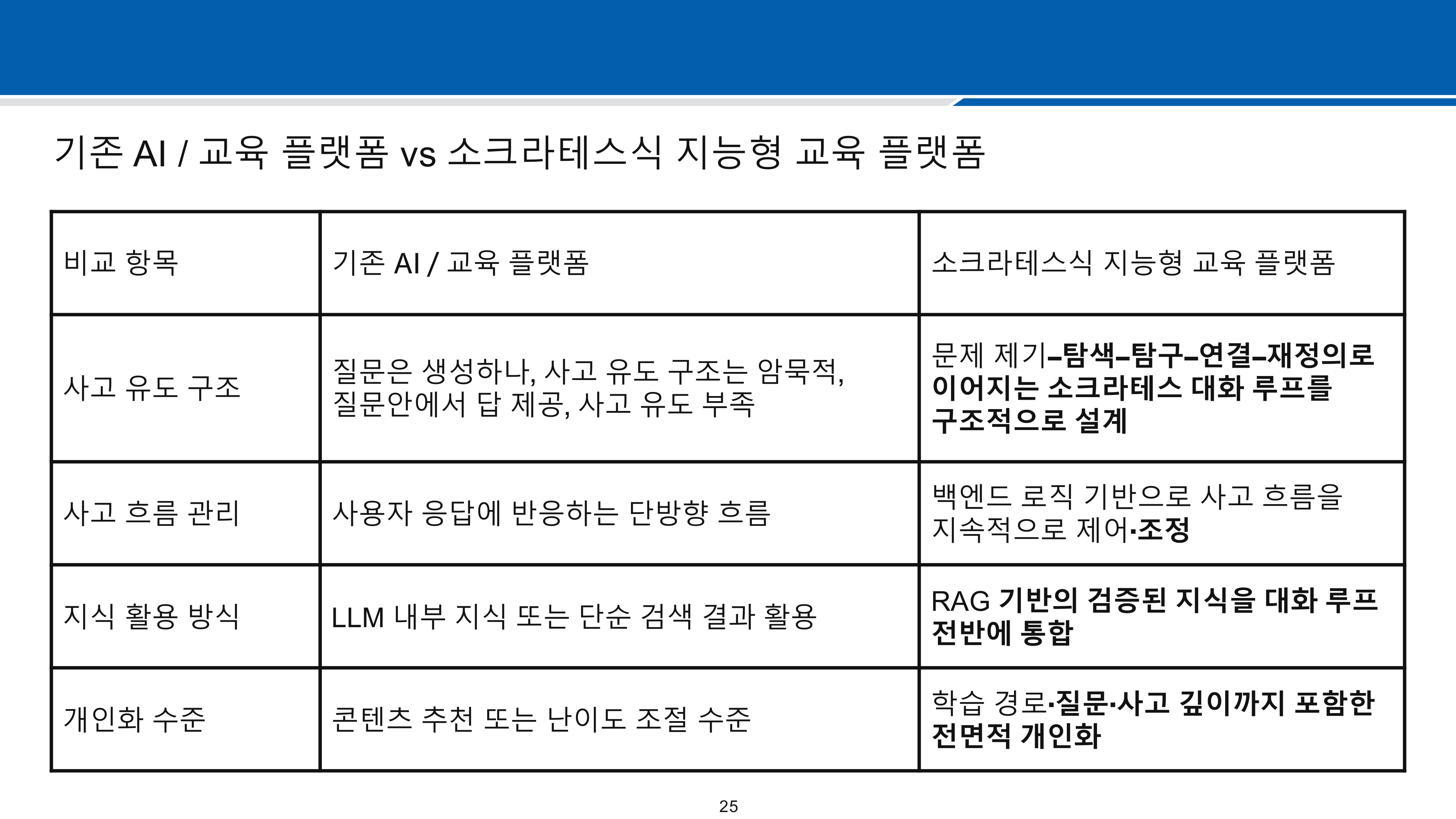 기존 생성형 AI는 표면적인 질문만 생성하여 사고 유도가 부족했습니다. 이를 해결하기 위해 단계별 소크라테스 루프 자동화 엔진을 개발했습니다.